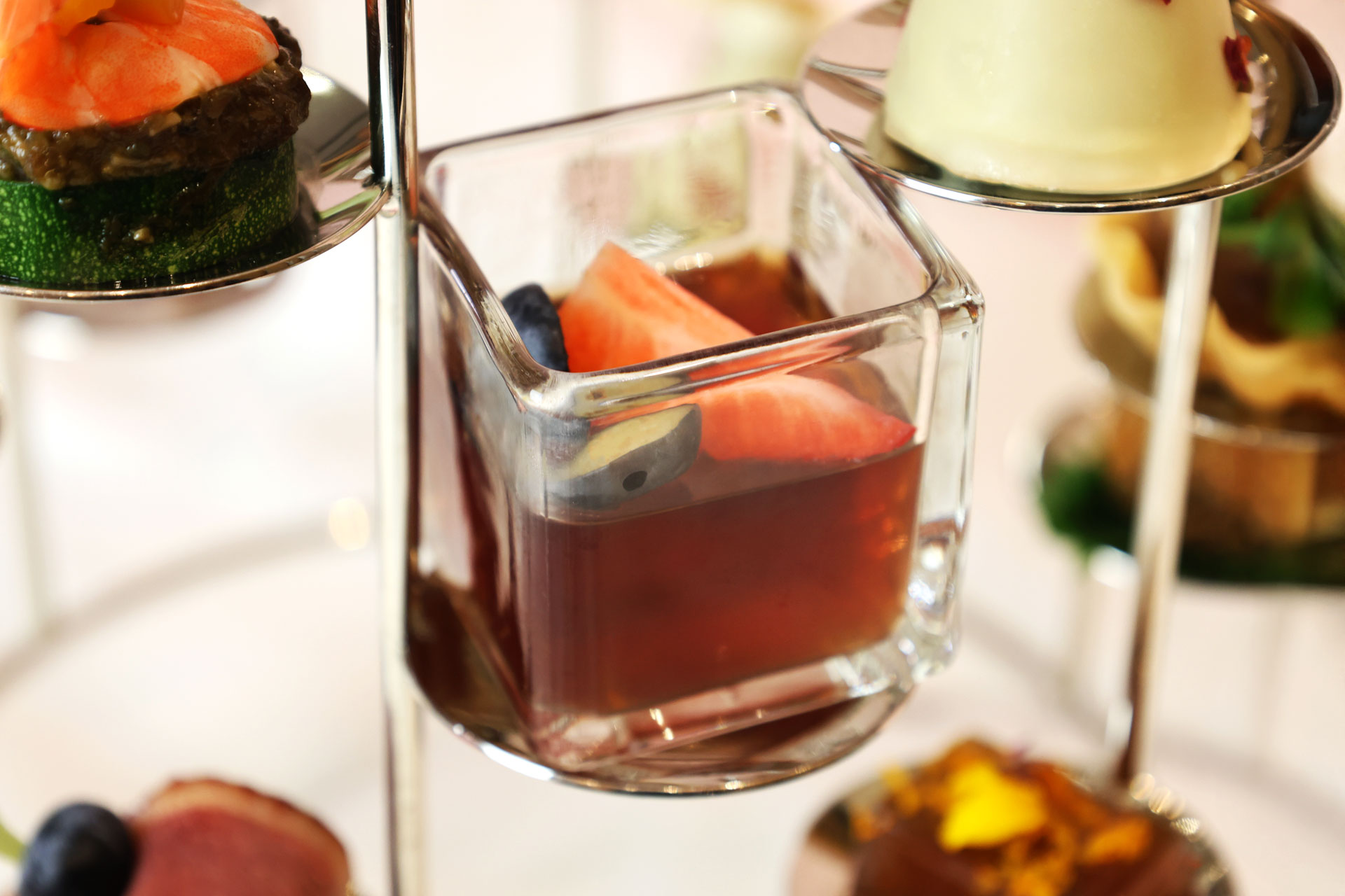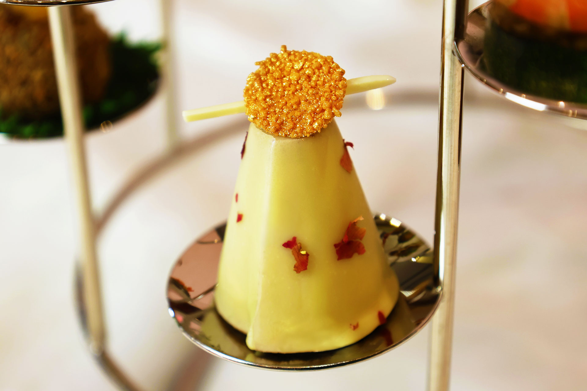 主廚團隊選用 薑芒綠茶、四紅果茶、仕女伯爵茶 等代表性茶款,將茶葉透過浸萃或研磨融入料理之中,讓茶香不只存在於茶杯,而是延伸至鹹點與甜點的每一道細節,12款鹹甜點呈現層次分明、清新優雅的風味節奏。