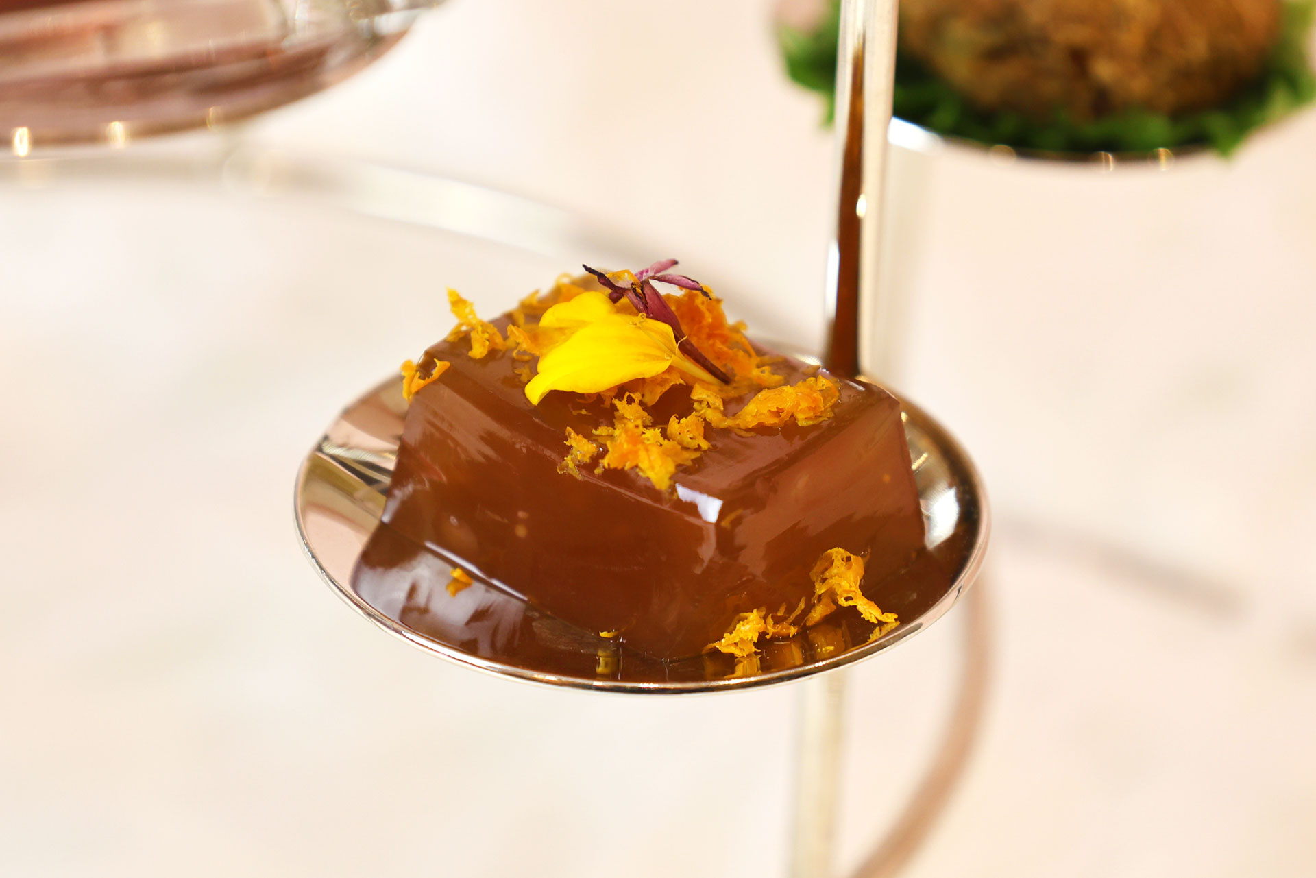 選用細緻白肉魚製成魚凍,融入淡雅茶香,入口先感受魚肉的清甜,再由桂花的花香與橙皮的清新果酸在口中綻放,結合中式桂花香氣與柑橙果韻,適合作為開胃前菜。