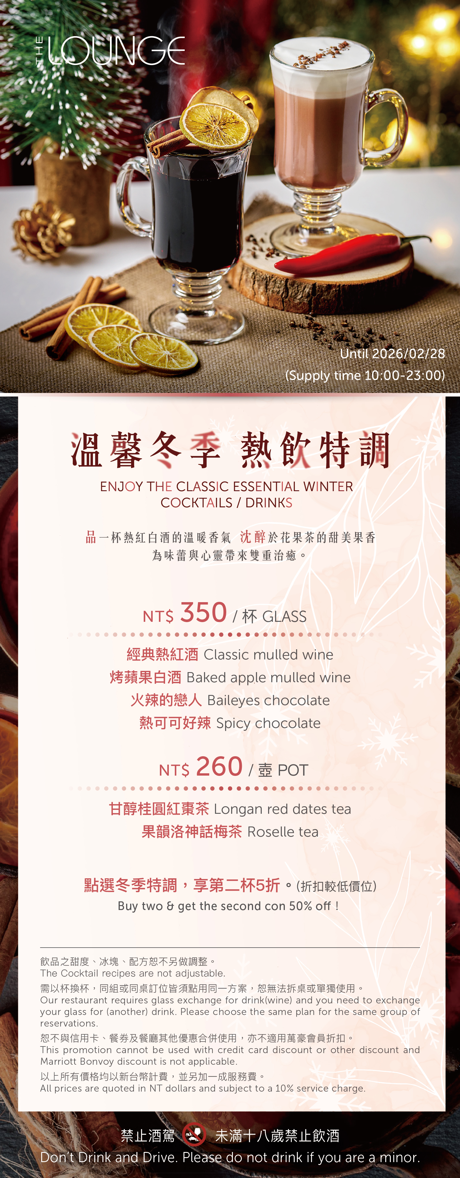 即將迎來寒意漸濃的季節,位於七樓的 THE Lounge 大廳酒吧即日起推出「溫馨冬季 熱飲特調」系列飲品,從經典熱紅酒、烤蘋果白酒,到熱可可等,每一杯都像冬天裡的小擁抱!