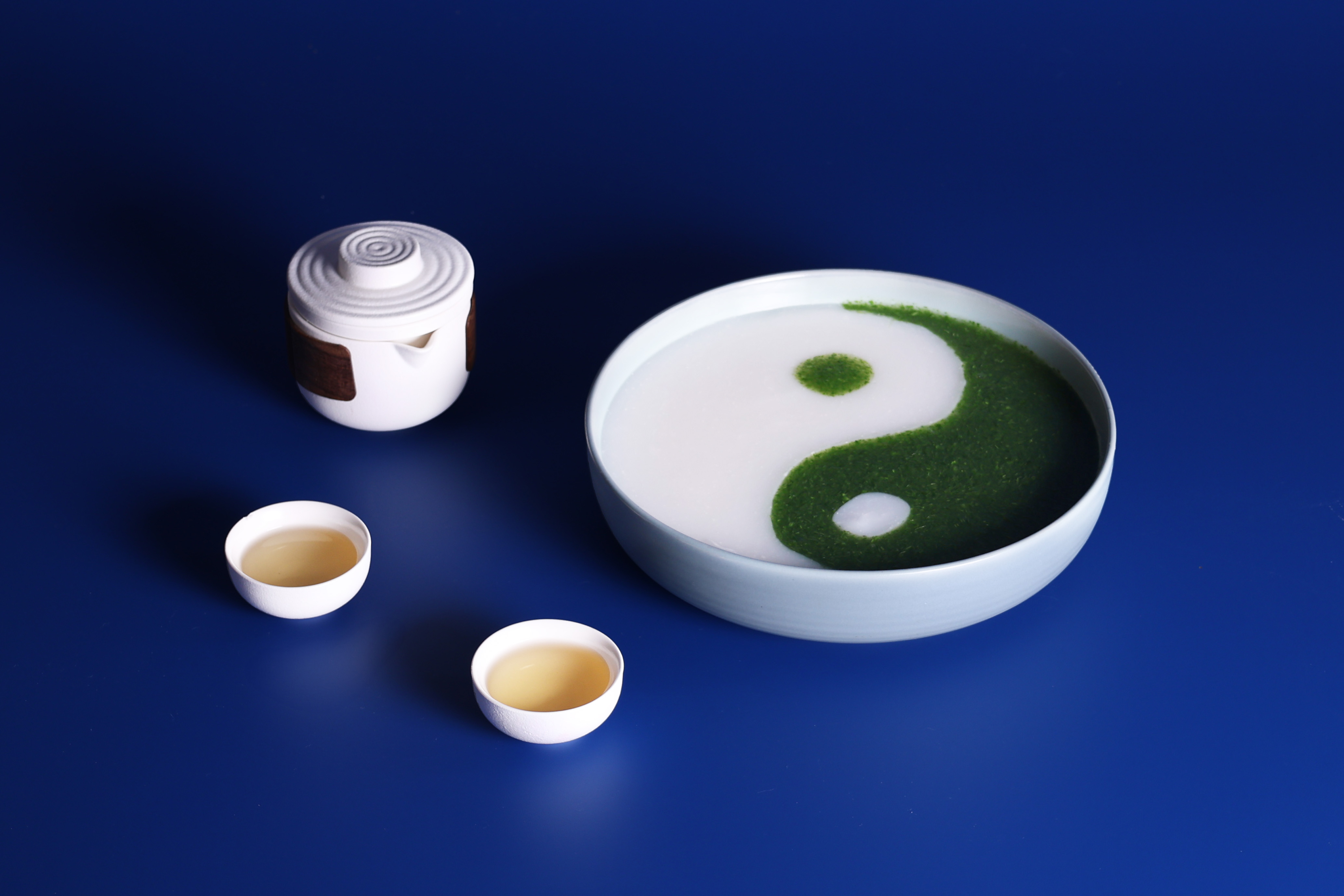潮汕名菜護國菜做為改良發想,白羹用雞肉南北杏熬製,綠羹以莧菜菠菜勾芡,搭配干貝、蟹腿、蝦仁,呈現太極造型,兼具濃醇與清爽。