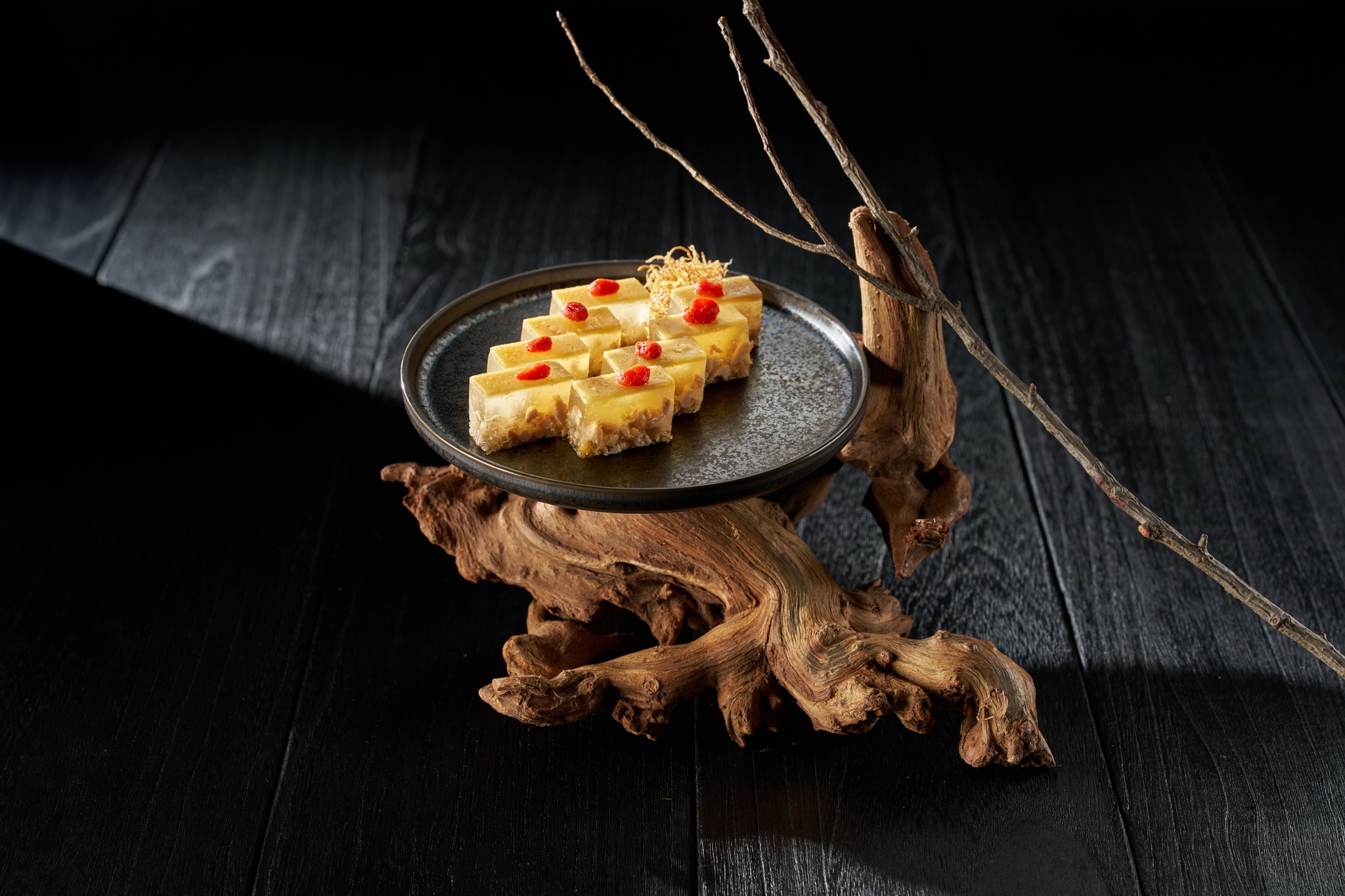 粵亮主廚以經典台味麻油雞巧思融入上海傳統水晶肴肉凍之中,將濃郁的麻油香氣與鮮嫩雞肉、澄澈透亮的凍體層層交疊。晶瑩如玉的外觀下,封存的是細火慢熬的雞湯精華,入口微鹹帶甘、香氣馥郁,伴隨淡雅的麻油溫潤,滋味層次豐富,開啟味蕾的精緻序曲。