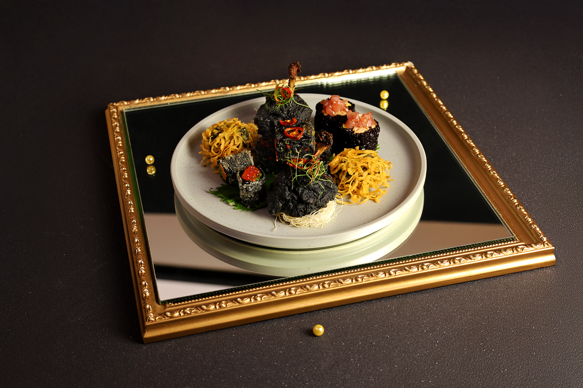 .黑金蘆筍鮭魚捲:鮭魚柔嫩、蘆筍爽脆,黑金點綴增添視覺亮點。