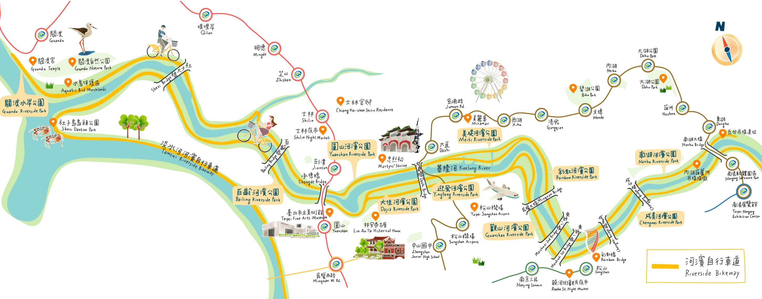 騎乘自行車探索台北,飽覽水岸綠地風光,享受河畔台北城耀眼夜景。推薦「基隆河河濱自行車道」全長47公里,沿至關渡、基隆,跨足大台北十個河濱公園,亦或是細說基隆河的歷史故事。
