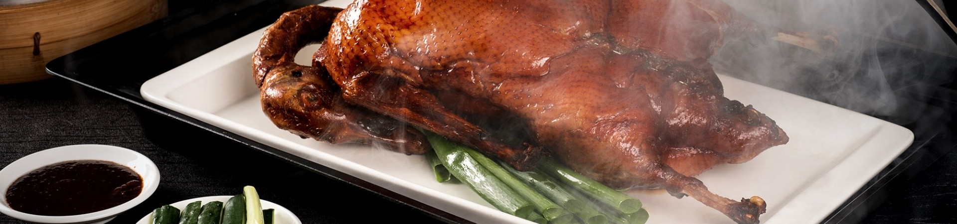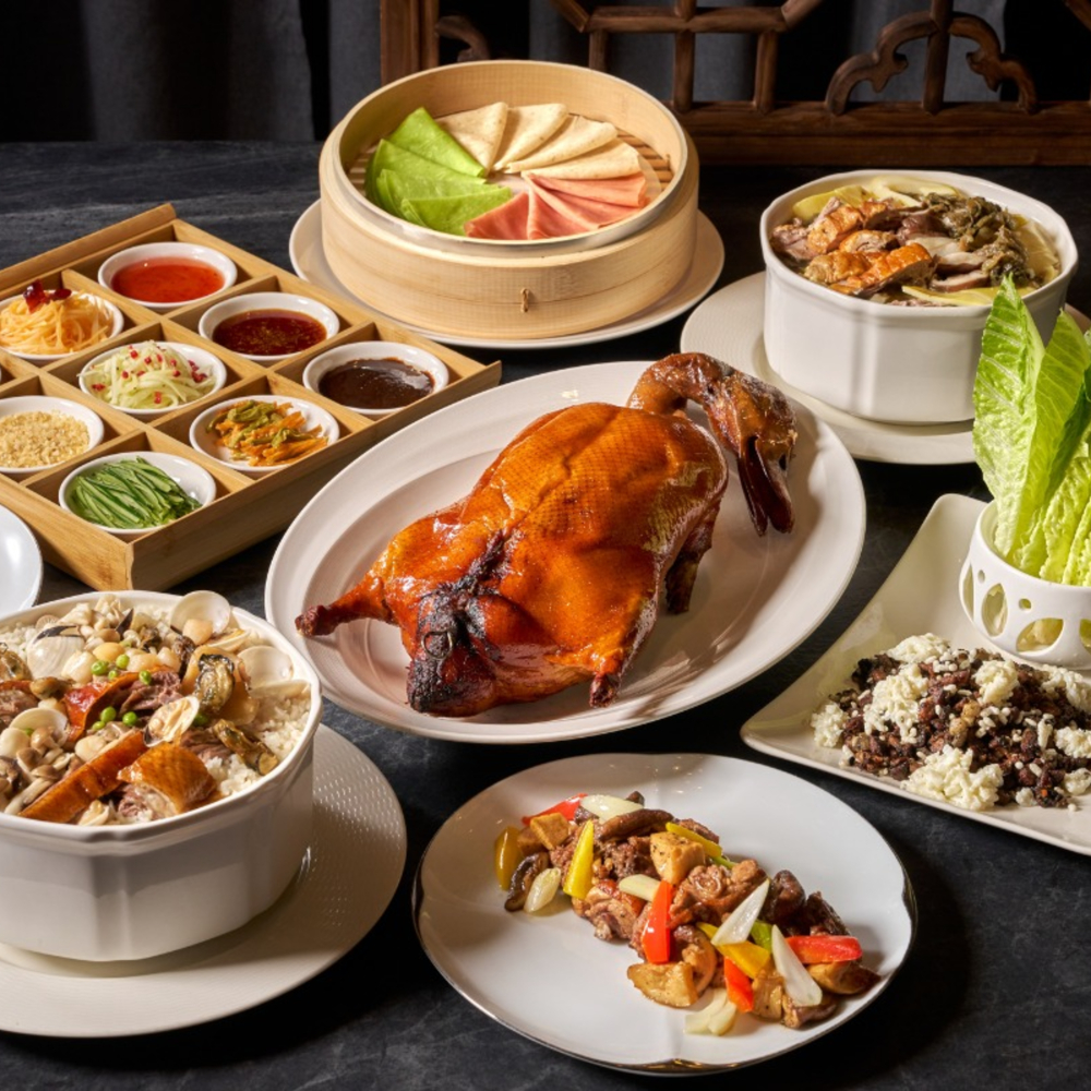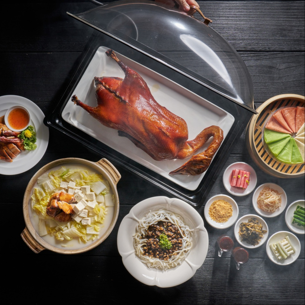 粵亮必試招牌「靚皮烤鴨」,承傳廣式烤鴨古法,選用 3KG 重的櫻桃鴨,依古法炭烤至鴨皮酥脆多汁,並搭配梅子酒與蘋果汁調製而成的招牌甜麵醬,以及特色醬料楓糖金薑醬、佐麻辣酸菜、洛神汁釀葡萄等特色小菜,創意吃法裏上花生跳跳糖,入口後在嘴中翻翻起舞,清爽開胃蹦出新滋味!