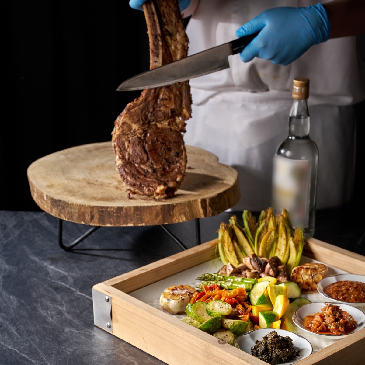 出餐時,戰斧牛高掛於粵亮訂製肉架之上,桌邊淋上金門高粱點火炙燒,再由師傅於服務現切、搭配松露香椿醬與蒜片享用,吃出不同的香氣表現。