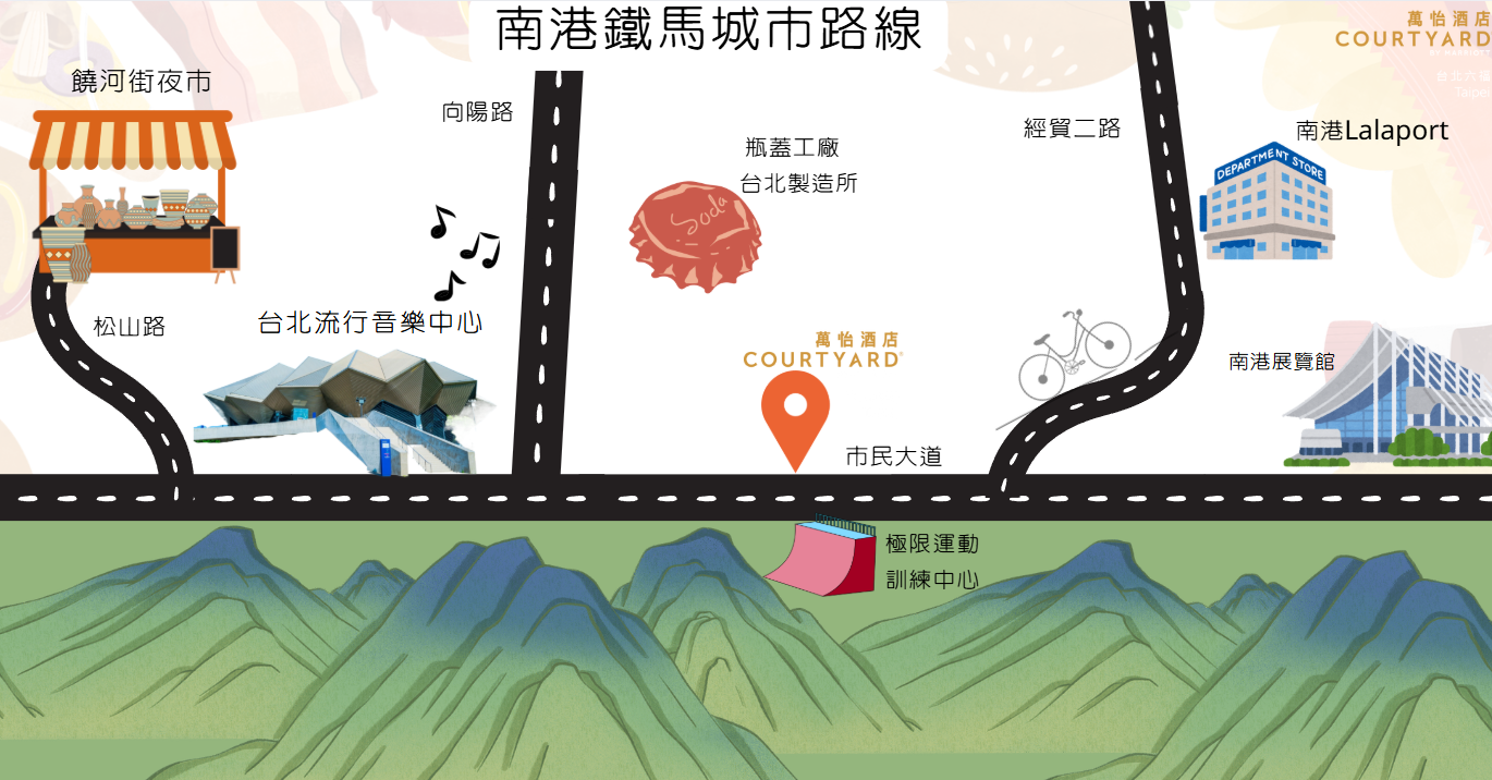 南港車站(CITY LINK) → 蔦屋書局 → 瓶蓋工廠台北製造所 → 台北流行音樂中心 → 饒河街夜市