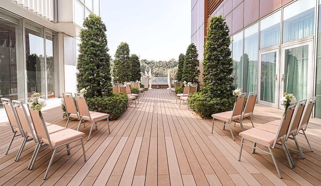 以 270 度山海視野為背景。此露臺緊鄰「敘日全日餐廳」的落地窗與植栽景致,讓自然光線自由灑入,其向外的植栽綠意與城市山景交織成別緻情境。