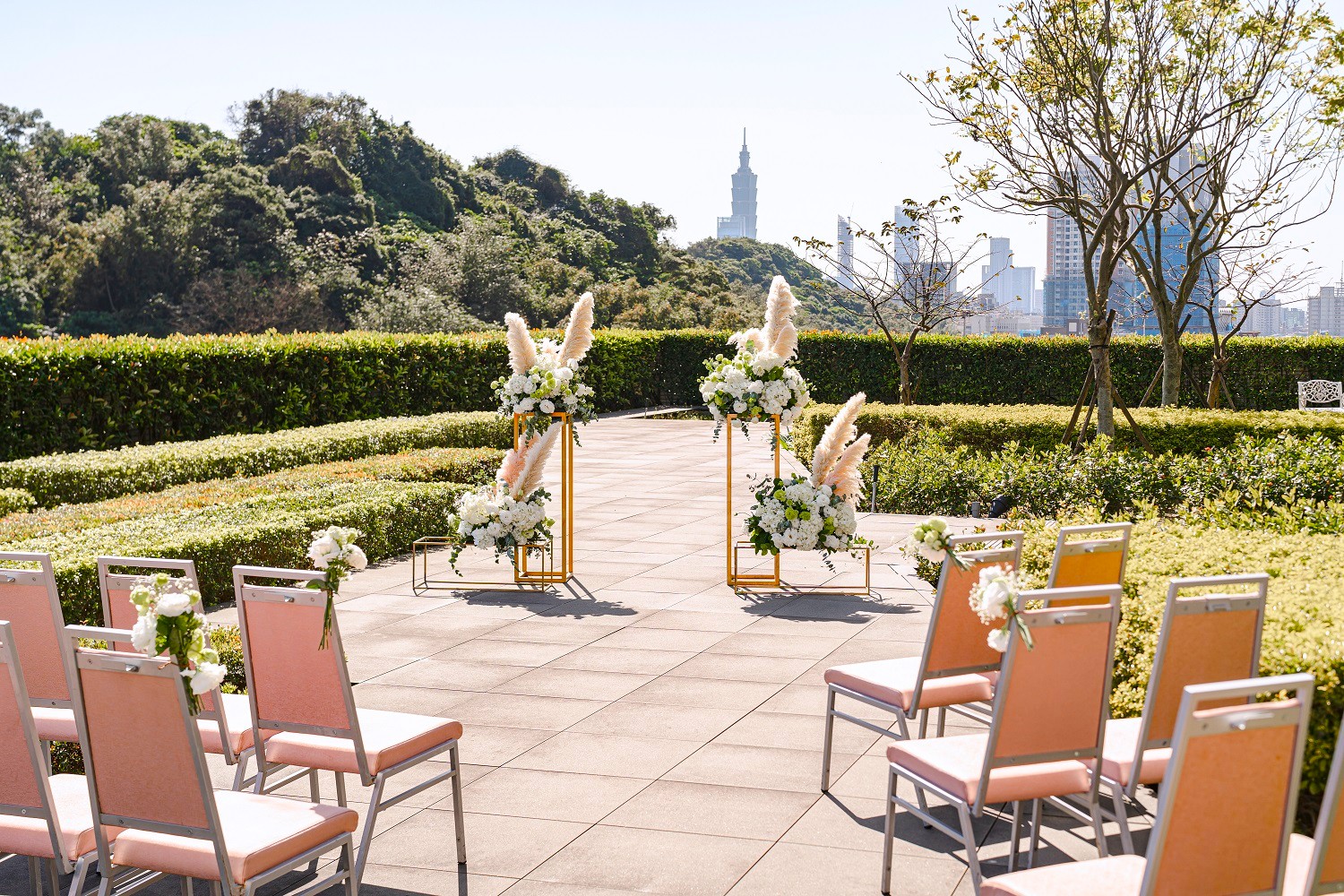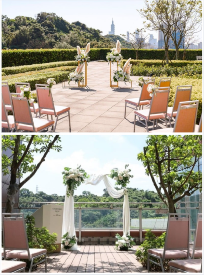 7樓戶外證婚區結合現代簡約設計與自然景觀,270°的山景與台北101天際線,