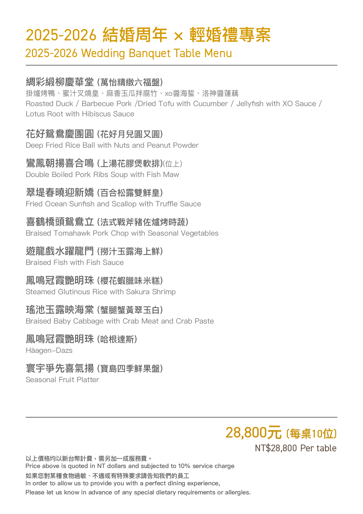 專案價格:6桌起訂,每桌 NT$28,800+10%(10位/桌)