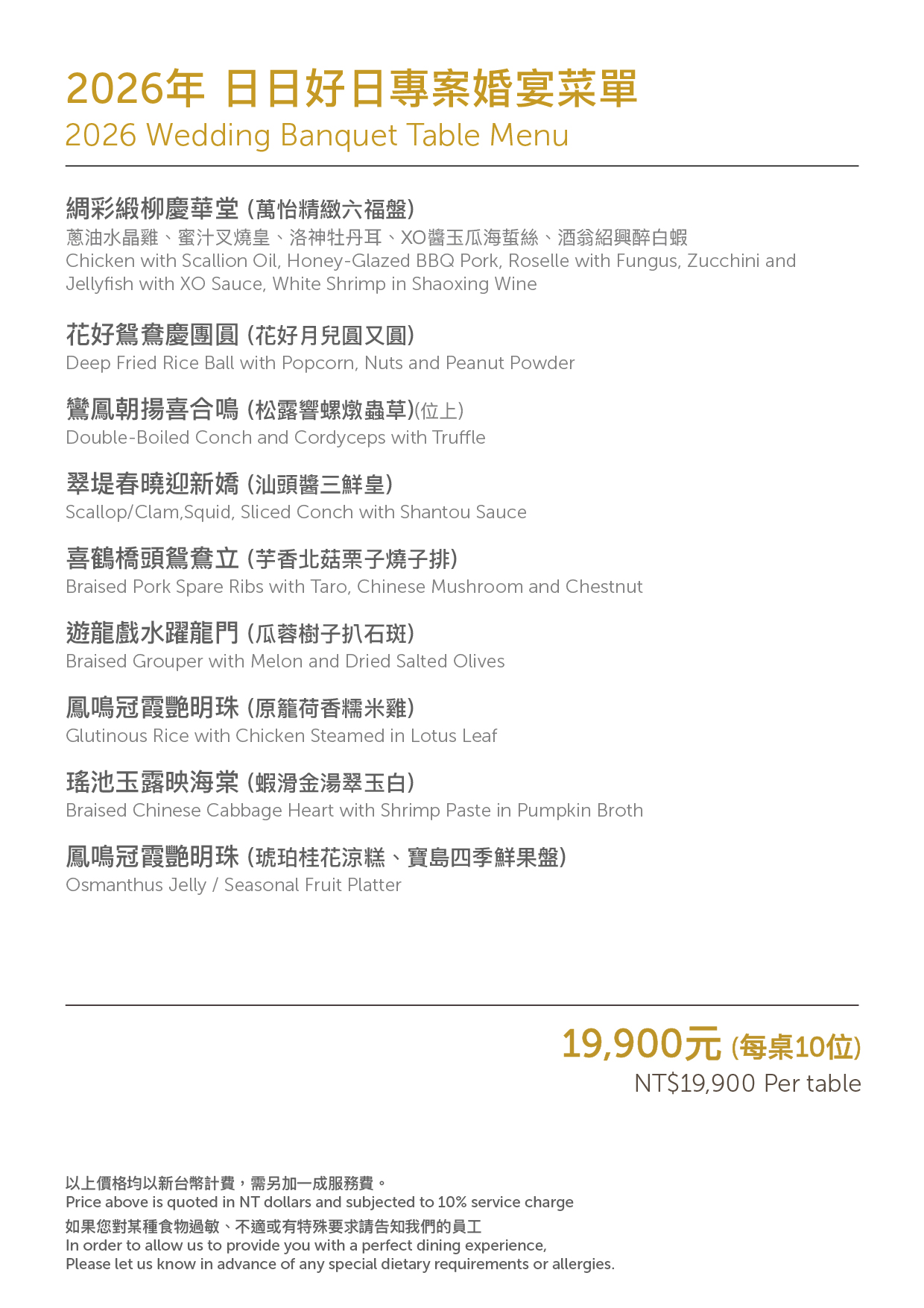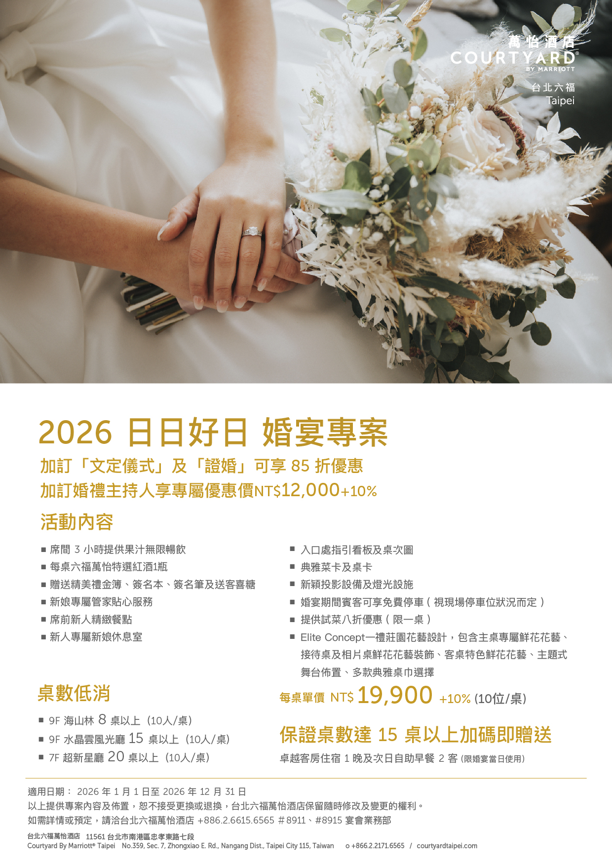 於指定日專屬優惠,每桌十人只要 NT$19,900+10%,尊享各式貼心禮遇與專屬優惠,達指定桌數加贈婚宴當日住宿乙晚!