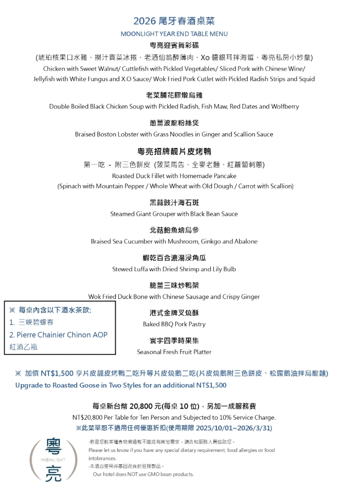 -早鳥優惠:於用餐日前兩週預定並付 30% 訂金,享免 10% 服務費