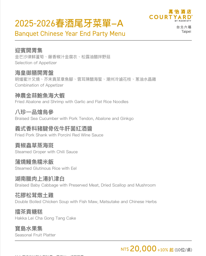 -平日(週一至週四) NT$20,000+10%/桌(10人)