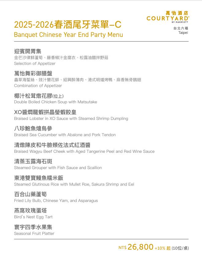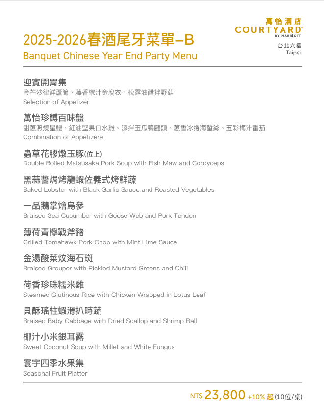 -假日(週五至週日) NT$23,800+10%/桌(10人)